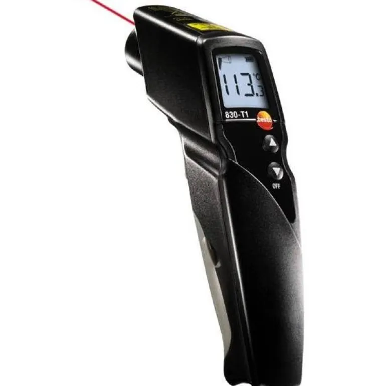 Testo 830-T1 on monipuolinen ja nopea IR-lämpötilamittari, jossa on 1-pistelaserosoitin. 830-T1 mittaa nopeasti ja helposti jännitteisten tai pyörivien osien lämpötilan, ja taustavalaistu näyttö on helppo lukea myös vaikeissa valo-olosuhteissa. Suosittu malli teollisuudessa ja LVI-alalla. Lämpötilamittarin säädettävä päästökerroin mittausalueella on 0,1-1,00 ja -30-+400 ° C. Hälytysten ylä- ja alarajat vapaasti säädettävissä. Testo 830-T1 soveltuu käytettäväksi ympäristöissä, joissa lämpötila on -20 ja +50 ° C välillä. Käyttövoimana 9 V: n alkaliparisto (mangaani), ja pariston toiminta-aika on 15 tuntia.