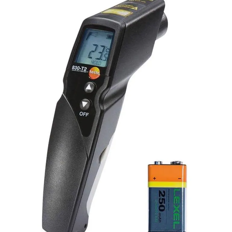 Testo 830-T2 on infrapunalämpötilamittari, joka mittaa sekä kosketuksettomasti että ulkoisilla antureilla. Kaksipistelaser merkitsee mittauskohdan ylä- ja alareunat, joten tiedät tarkalleen, millä pinnalla mittaat. Päästökerrointa voidaan säätää vapaasti välillä 0,1 – 1,00, ja taustavalaistu näyttö on helppo lukea myös vaikeissa valo-olosuhteissa. Tämän infrapunan lämpötilamittarin mittausalue on -30 – +400 ° C ja mittausoptiikka 12:1. Hälytysten ylä- ja alarajat vapaasti säädettävissä. 830-T2 soveltuu käytettäväksi ympäristöissä, joissa lämpötila on -20 ja +50 ° C välillä. Käyttövoimana 9 V: n alkaliparisto (mangaani), ja pariston toiminta-aika on 15 tuntia.