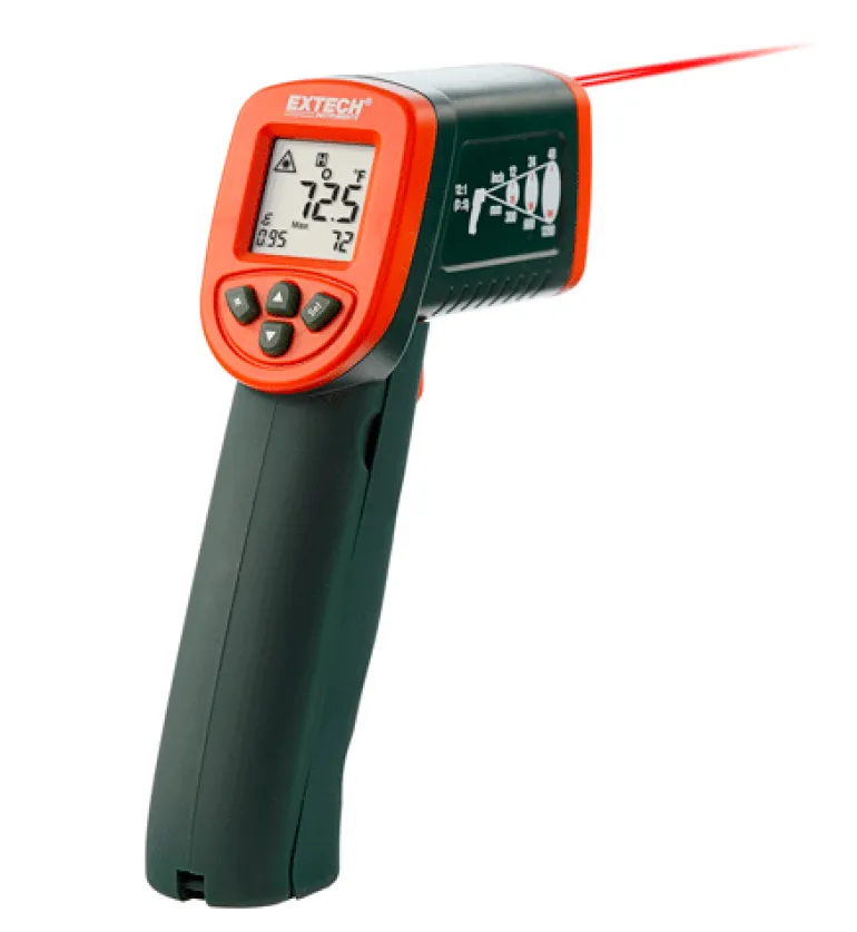 Infrapunalämpömittari (IR) K tyypin lämpöanturi kontaktiliitännällä. Mittaa jopa 600 °C:seen. Sisäänrakennettu laserosoitin tunnistaa kohdealueen ja parantaa kohdetta. K tyypin tulo mahdollistaa korkeiden lämpötilojen mittaamisen jopa 1000 °C:seen. Sisäänrakennettu lämpötila-anturi mittaa myös ilman lämpötilaa.