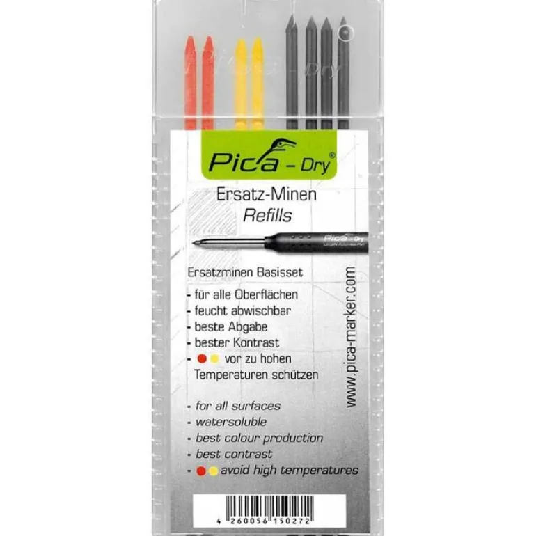 Lyijyterät (8 kpl) Pica Dry -merkkauskynälle. Vesiliukoiset värit, jotka on helppo pyyhkiä sileiltä pinnoilta kostealla rätillä. Grafiittiterien kovuus on 2B, ja kiinnittyvät siten paremmin moniin alustoihin. Keltainen ja punainen sopivat tummien pintojen merkintään. Sopivat Pica Dry -merkkaus-/timpurinkynälle.Sisältö: 4 x grafiittiterää (musta), 2 x punaista terää, 2 x keltaista terää.