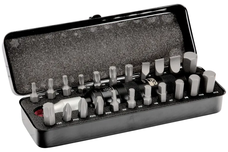 Iskevä ruuvikärkisarja 1/4″ PH-, TORX® ja kuusiokolo-ruuveille. Ruuvikärkisarjassa on 23 osaa: 21 ruuvikärkeä, 1 iskevä ruuvinväännin ja 1 kärkipidikkeen muuntokappale.
