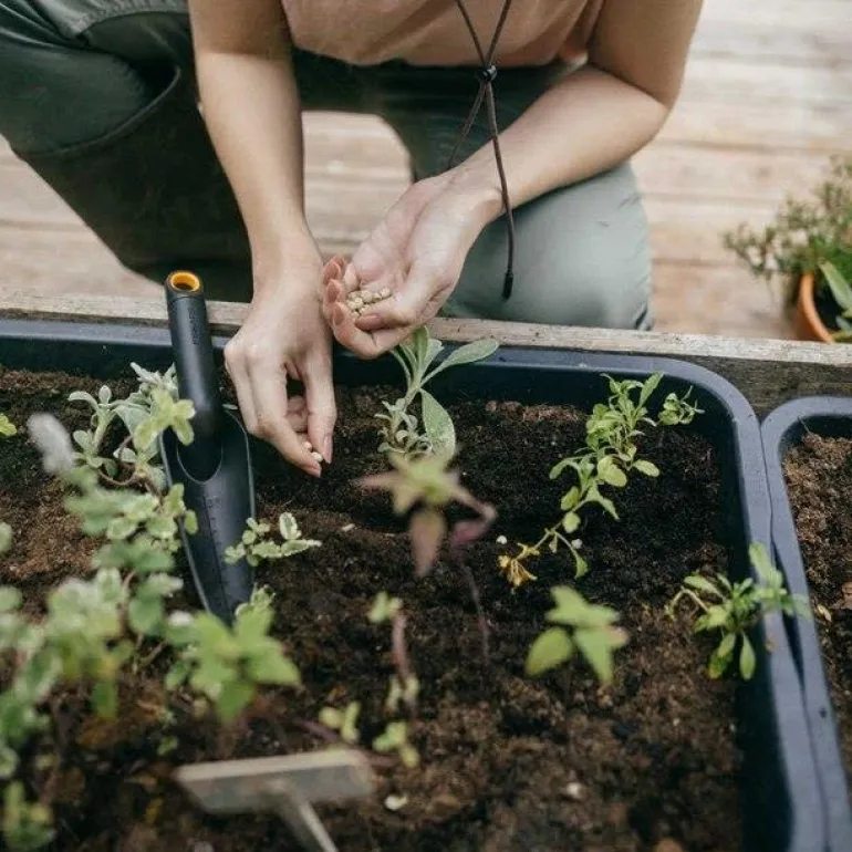 Fiskars Solid™ -istutuslapio, joka soveltuu pienten taimien, sipulien ja pienten kasvien siirtelyyn myös ahtaissa väleissä. Ergonominen kahvan muotoilu.