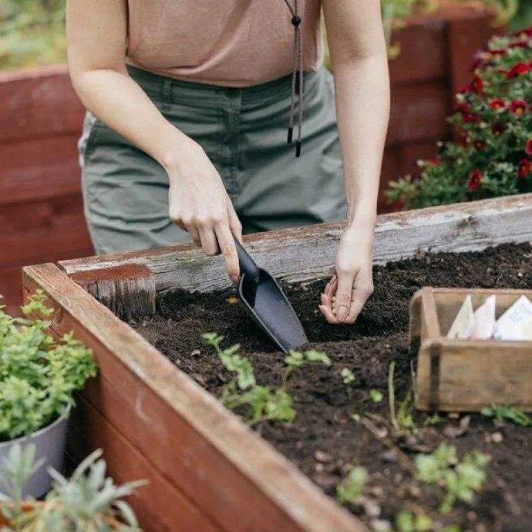 Fiskars Solid™ -istutuslapio, jonka ergonominen kahva vähentää käteen kohdistuvaa rasitusta.