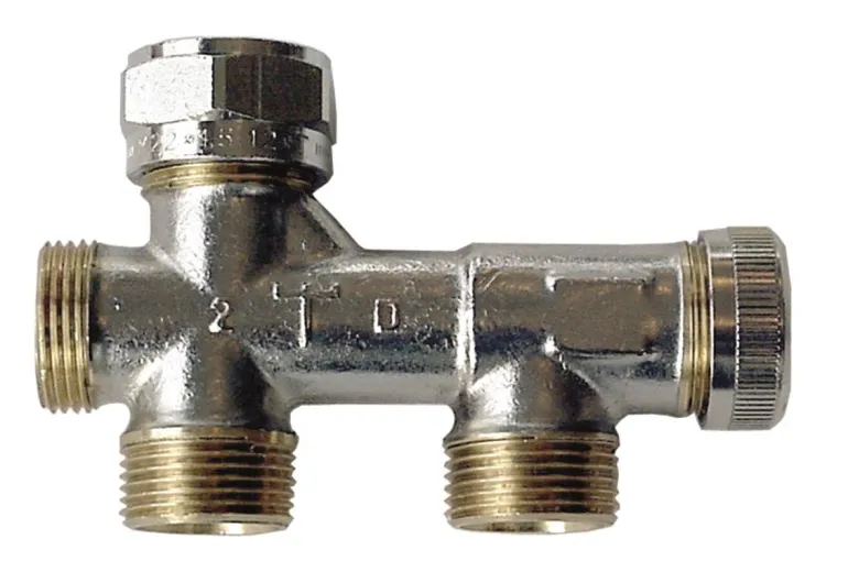 Jakelijan alaosa patterikytkimeen RA-K-VB, käännettävissä, liitäntä alas tai sivulle. Käytetään 2-putkisissa järjestelmissä, joissa on pumppukierto.