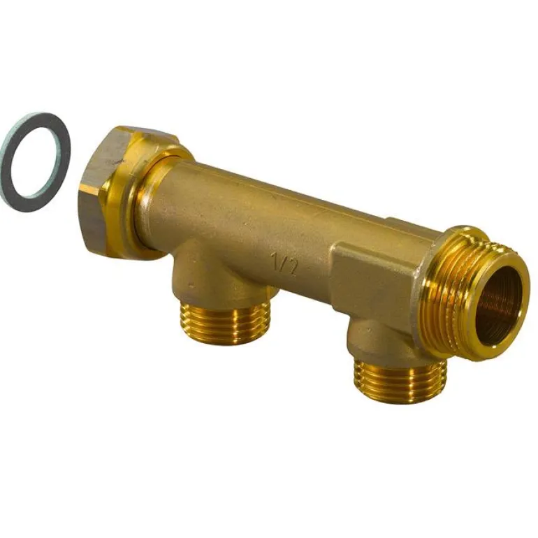 Jakotukki, jossa on 2 tappia, pyörivä mutteri G3/4 ja ulkokierre G3/4 sekä tasotiiviste. Valmistettu sinkinkestävästä messingistä ja keskietäisyys 50 mm.