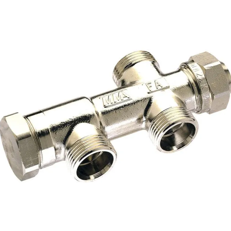 Messingistä valmistettu jakotukki, joka on käännettävissä ala-/ylä- tai sivuliitäntään ja jossa on sisäänrakennettu sulku. Jakotukki on varustettu sulkukaralla, joka on piilossa kannen takana, 10 mm kuusioavainkahva. Enimmäislämpötila 100° C ja vähimmäislämpötila 5 °C.
