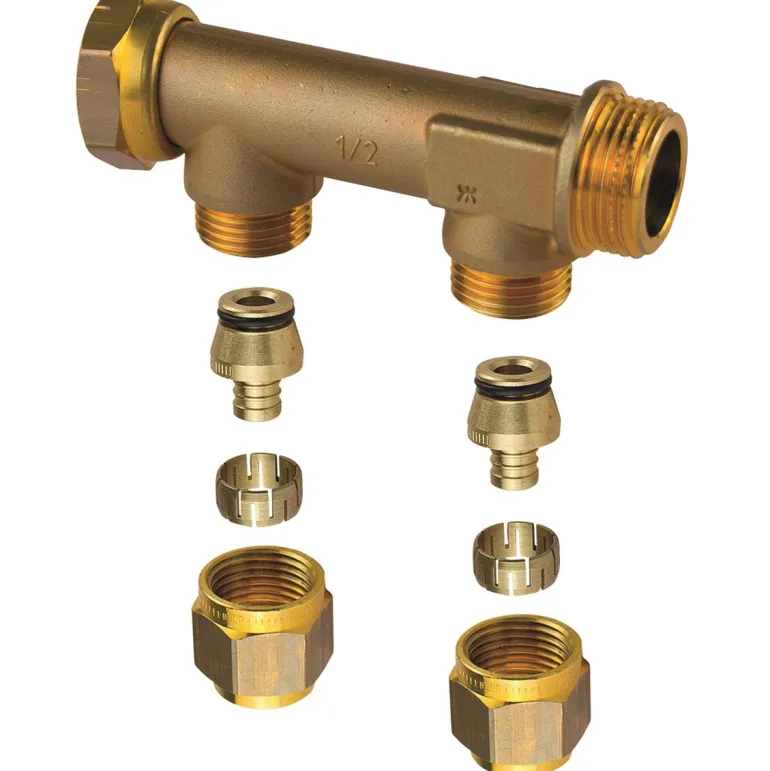 Jakotukki sinkkikadonkestävää messinkiä, varustettu pyörivällä mutterilla ja tasotiivisteellä. Liittimien keskietäisyys on 50 mm ja jakaja on yhteensopiva Uponor Combi/Aqua -putkien 15 x 2,5 mm kanssa.