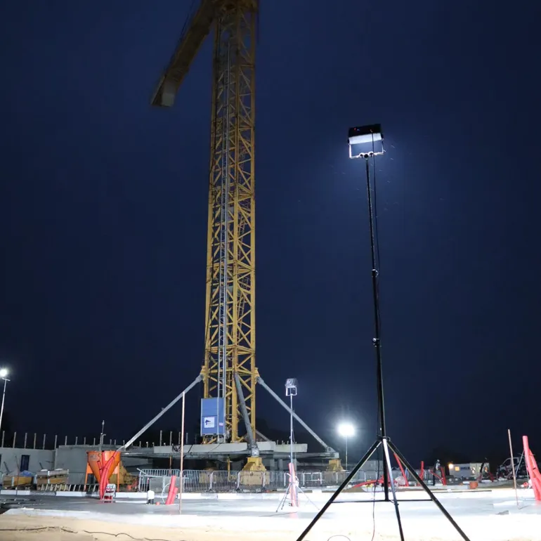 Tukeva jalusta SITE LIGHT-työmaavalaisimien asemoimista varten. Jalusta on varustettu ilmatoimisella turvamekanismilla, joka suojaa äkillisiltä pudotuksilta jalustaa pidennettäessä ja laskiessa. TRIPOD 4,5M on pidennettävissä 2,2:sta 4,5:een metriin. Valaisimen kiinnike on kallistettavissa sopivaa valokulmaa varten.