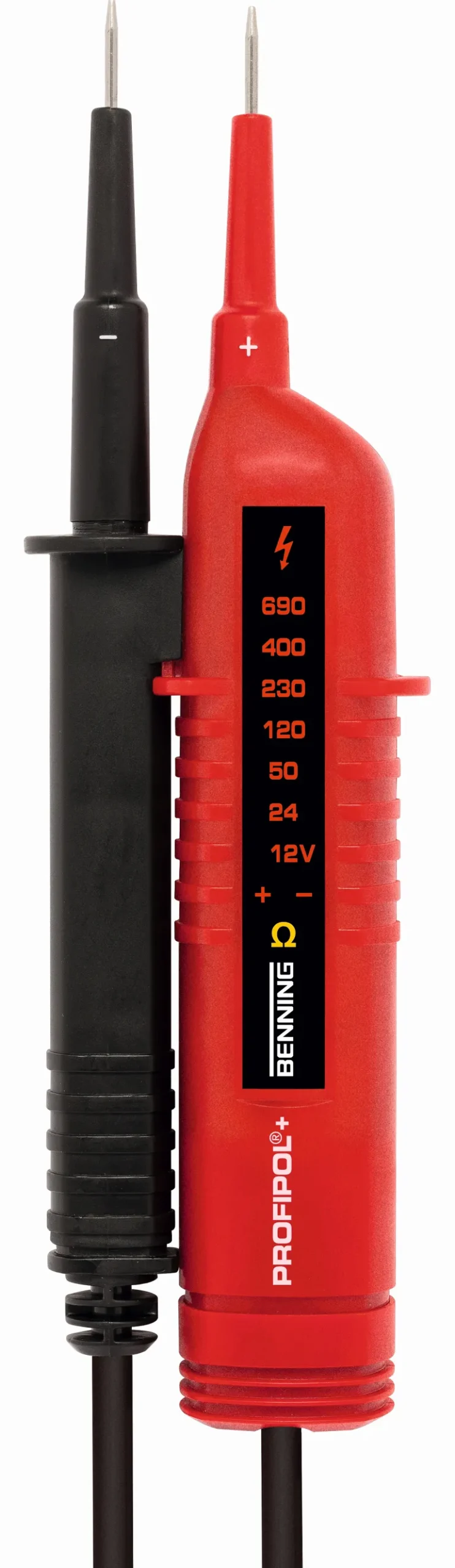 Benning Profipol+ on jännitteenkoetin, joka ilmaisee jännitteen alueella 12 – 690 V AC/DC. Jatkuvuustesti 100k asti summerin ja diodin avulla. 1-napaisen johtimen jännitetesti ja napaisuustesti (+/- LED), jännitetestaus toimii ilman paristoja.