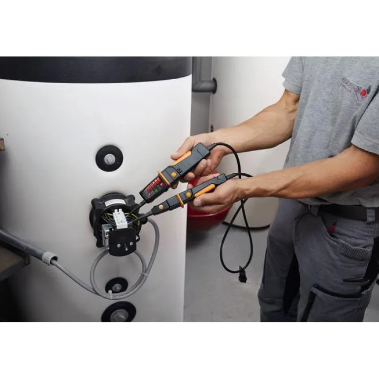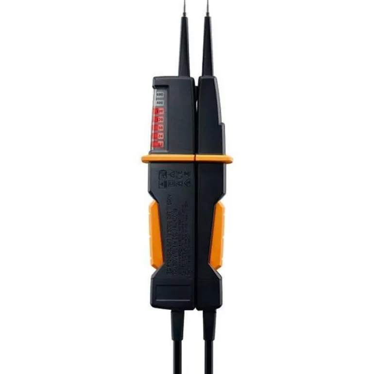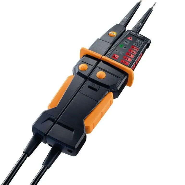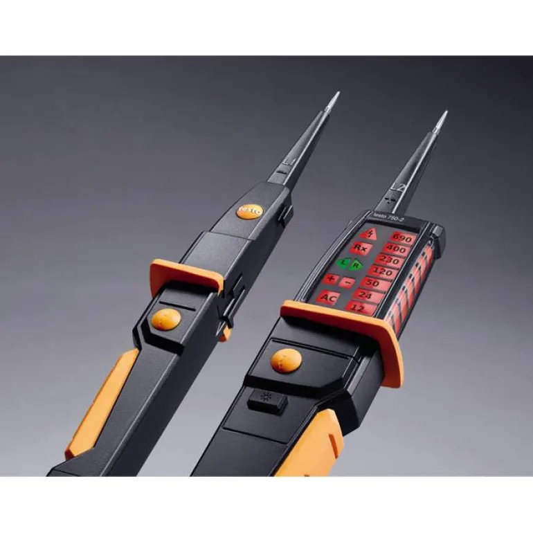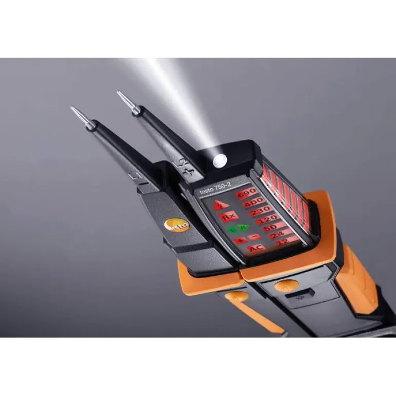 Jännitetesteri pysäytinkauluksella turvallista otetta varten ja pyöreä LED-näyttö, joka näkyy kaikista asennoista. Laitteen jännitetestausalue on 12 – 690 V. Tärkeimpiin toimintoihin kuuluvat jännitteen testaus, jatkuvuuden testaus ja pyörivien magneettikenttien mittaus. Testo 750-2:ssa on mittauspisteen valaisu ja laukaisutoiminto ylivirtasuojia varten.