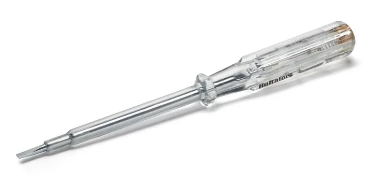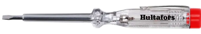 Ruuvimeisseli sisäänrakennetulla jännitteenkoettimella 120–250 V:lle. Läpinäkyvä eristetty kahva diodilla ja muovipinnoitetulla varrella.