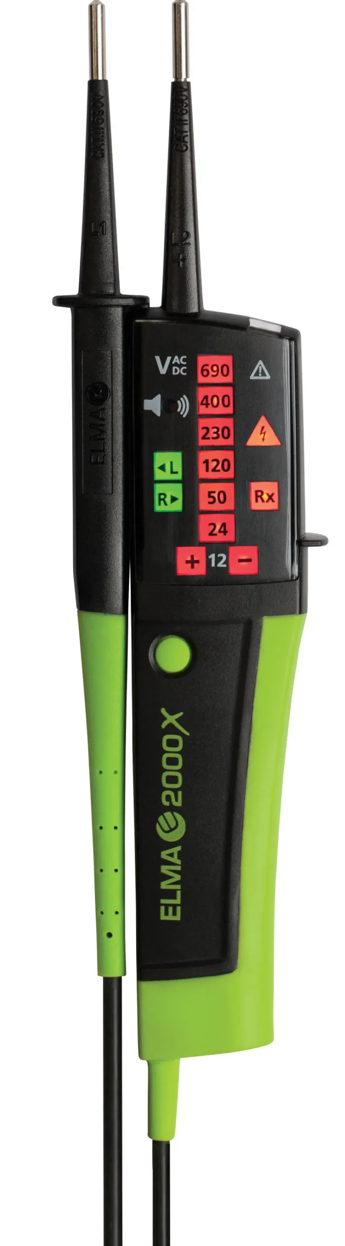 Elma 2000X on jännitteenkoetin, jossa on monia parannuksia. Esimerkiksi testipiikkien älykäs kiinnitys etäisyydellä, jolla ne sopivat suoraan seinäpistorasiaan, sekä hyvän kosketuksen takaavat nerokkaat testikärjet niin 2 mm:n kuin 4 mm:n halkaisijalla. Napaisuuden näyttö: 100–690 V AC.