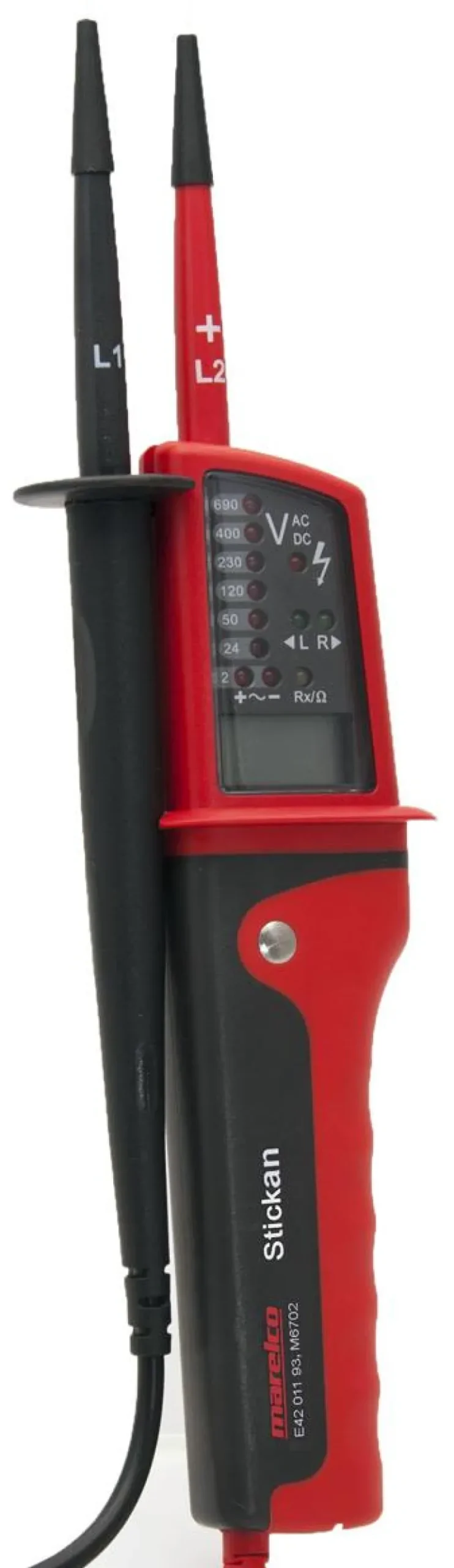 Marelco 42.6702 on jännitteenkoetin, jonka taajuusalue on 0-400 Hz. Kestävästä PVC:stä valmistetulla mittajohdolla ja mittauskärjessä olevalla taskulampulla, joka valaisee mittausalueen.