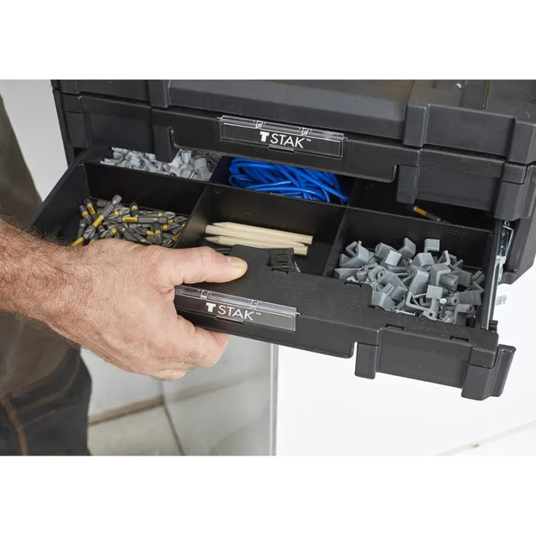 Järjestelmälaatikon kapasiteetti on 8 l, ja se sisältää tilanjakajan sekä kaksi laatikkoa ja siirrettävät jakajat. Kaksoismateriaalista valmistettu kahva varmistaa helpon ja vaivattoman noston. Osa FATMAX® TSTAK -järjestelmää – yhteenliitettävä, pinottava moduulisäilytysjärjestelmä.