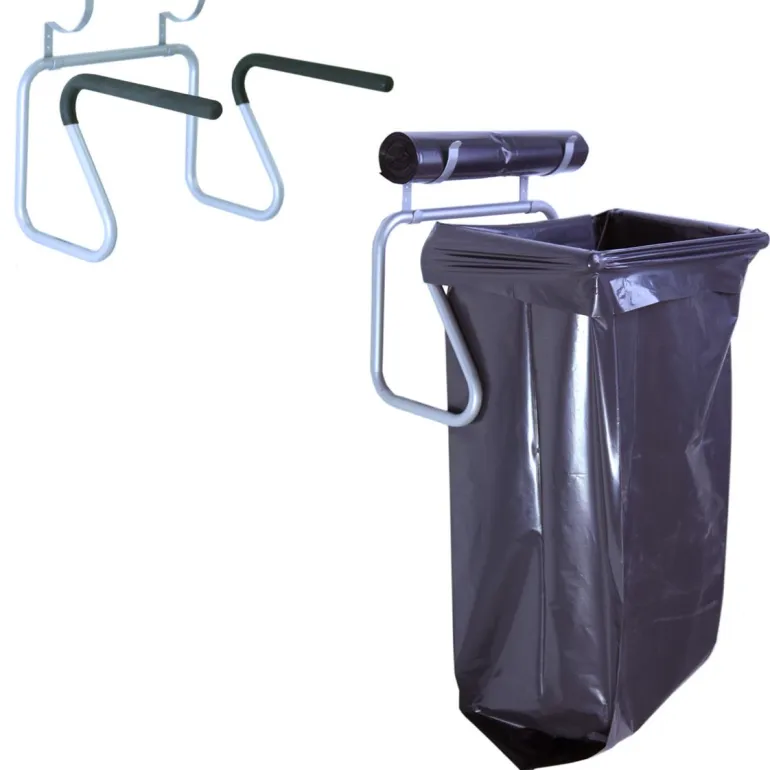 Roskapussiteline sinkityllä palautusjousitetulla putkella, jossa on musta kitkakahva joka varmistaa että pussi pysyy paikoillaan täytön aikana. 125 litran roskapusseille/jätesäkeille. Sisältää koukut ja pussirullanpidikkeen.