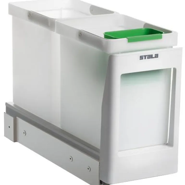 Kiskoilla liikkuva jätevaunu kahdella 10 litran astialla ja pienellä ongelmajäteastialla. Soveltuvan kaapin minimileveys 30 cm.