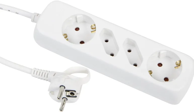 Jatkojohto 2:lla Euro-pistorasialla ja 2:lla maadoitetulla pistorasialla. Jatkojohto on valmistettu valkoisesta kestomuovista (johtimen poikkipinta-ala 1 mm²).