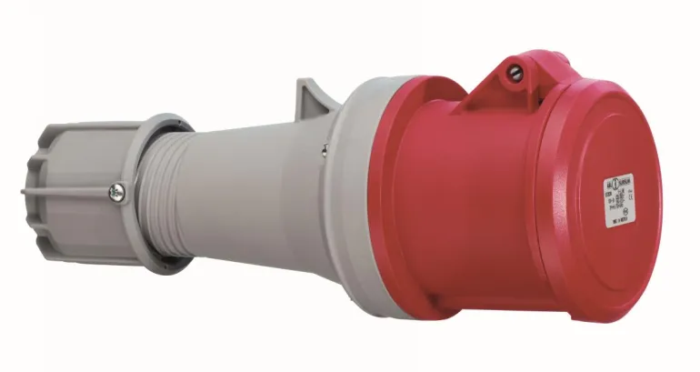A 63 A-jatkopistorasia suojausluokalla IP44. Varustettu tiivistävällä taivutussuojalla. Mukana ruuviliittimet.