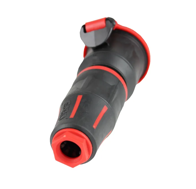Liitospistorasia, jossa kiinteä kumikotelo ja ulkoinen jännitteenpoisto. Malli soveltuu maadoitusliittimien tapeille ja on varustettu suojuksella.