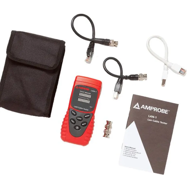 Beha-Amprobe LAN-1 on johdotustesteri avoimen piirin, oikosulun tai väärin johdotetun kaapeliasennuksen testaukseen. LAN-1 näyttää nopeasti, toimiiko testattava liitäntä. Voit joko käydä johdot läpi yksi kerrallaan tai antaa laitteen automaattisesti osoittaa ”pin-out”-kohdat.