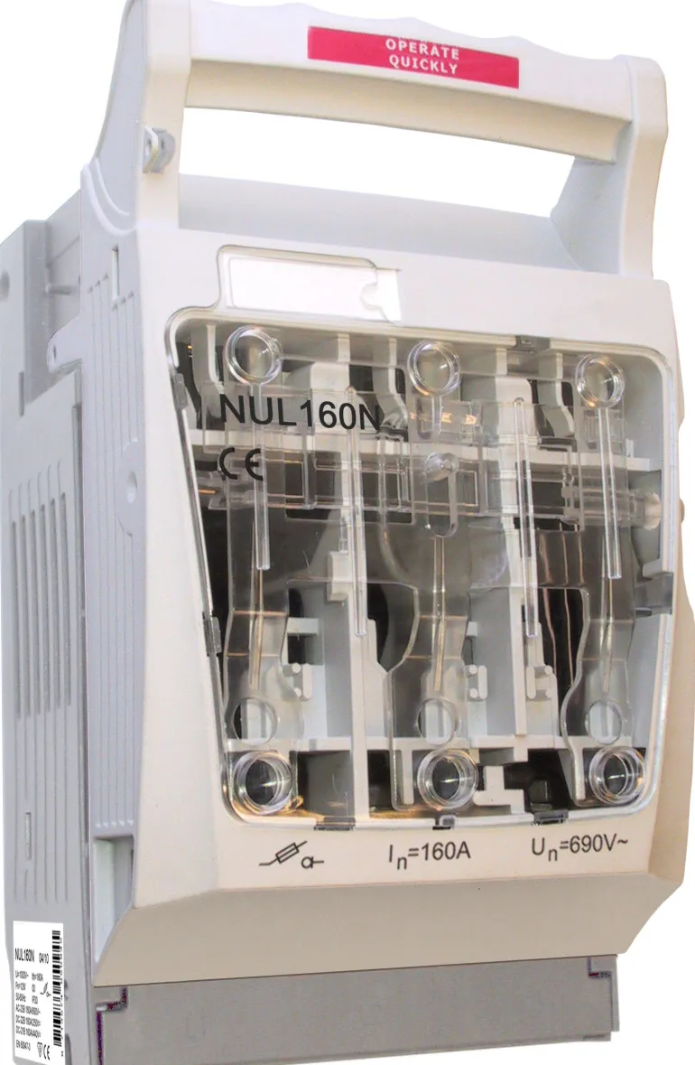 NUL160N, uuninluukku-tyyppinen 00-koon kahvasulakealusta. Luokiteltu jonovarokekytkimeksi ja täyttää standardin SS-EN 60 974-3:n mukaiset erotinta koskevat vaatimukset. Varustettu sammutuskammiolla, joka katkaisee jopa 80 kA:n virran jännitteellä 690 V AC. Tarkoitettu ruuvikiinnitykseen ja asennetaan esim. NSLBxx-tyypin kalusteisiin.