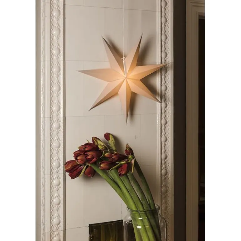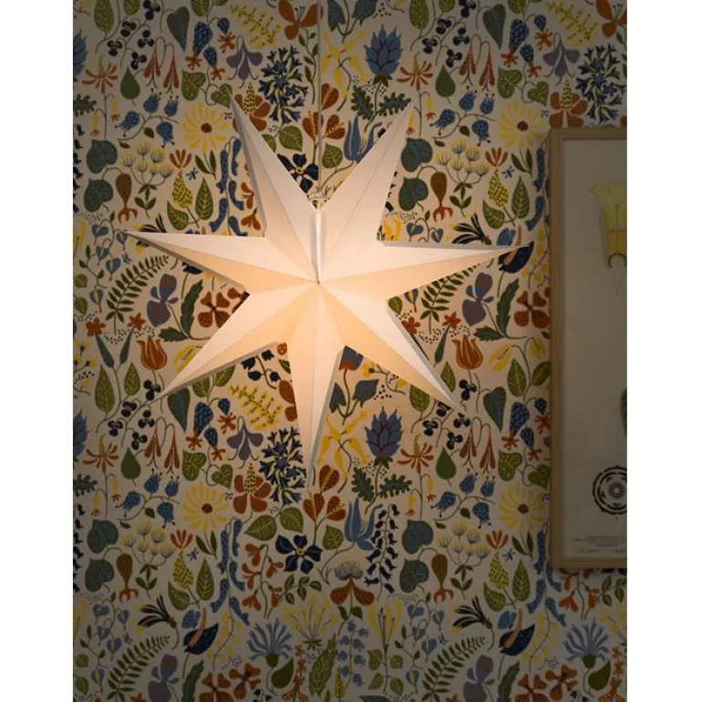 Valkoisesta paperista valmistettu joulutähti. Tähti on 7-sakarainen ja halkaisijaltaan 60 cm. Ei valonlähdettä.