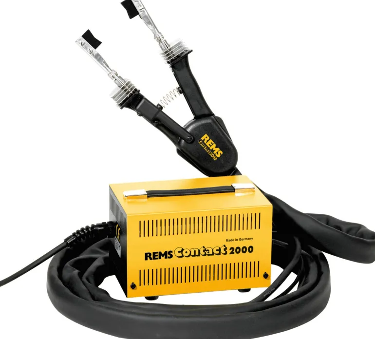 REMS Contact 2000. Sähköinen juotoskone kupariputkien pehmytjuottamiseen Ø6 – 54 mm, ؼ – 2⅛”. Verkkojännite 230 V, 50 – 60 Hz, 2000 W, ohjausjännite 24 V. Kompakti, tehokas sähkölaite pehmytjuottamiseen. Turvamuuntajalla. Asennustöihin ja teollisuuteen.
