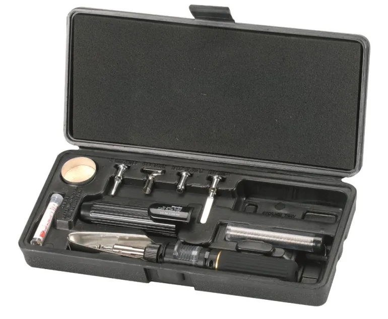 Juotoskynä, joka soveltuu hyvin juottamiseen, kutistamiseen, leikkaamiseen ja lämmittämiseen kentällä, jossa sähköä ei ole saatavilla. Toimitetaan lisävarusteita sisältävässä laatikossa. Varustettu automaattisella pietsosytytyksellä ja säädettävällä teholla. Alhainen lämpötila jopa 1300 ° C.