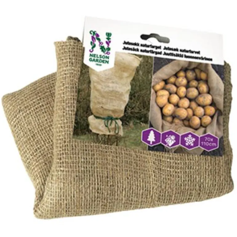 Juuttisäkki kasvien peittämiseen. Suojaa pakkaselta ja lumelta sekä voimakkaalta auringonpaisteeltakin, myös kuivuudelta keväisin. Voidaan käyttää mm. ruukunsuojana, polttopuiden varastoimiseen, vihannesten säilyttämiseen ja lahjasäkkinä jouluna.