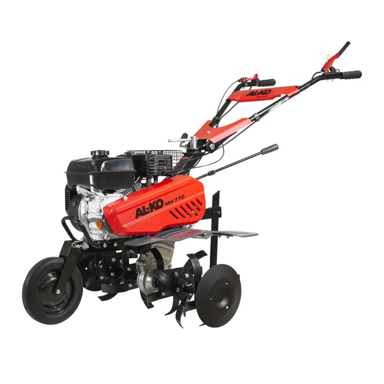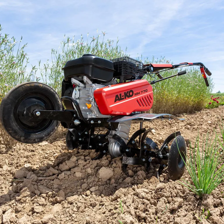 AL-KO MH 770:n työskentelyleveys on 77 cm ja se tarjoaa laajan valikoiman lisävarusteita monenlaisiin käyttötarkoituksiin. Tehokas moottori käyttää 6 terää, joiden muokkaussyvyys on jopa 33 cm. Kaksi vaihdetta eteen- ja yksi taaksepäin nopeuttavat ja tehostavat työskentelyä, kädensijat ovat säädettävissä sekä sivu- että pystysuunnassa, jotta työskentelyasento olisi mahdollisimman ergonominen ja hyvä. Mukana sivusuoja kasvien ja muiden kohteiden suojelemiseksi. Lisävarusteina saatavilla on vakoaura, yksipuolinen aura, peruna-aura ja rautapyörät paremman pidon takaamiseksi.