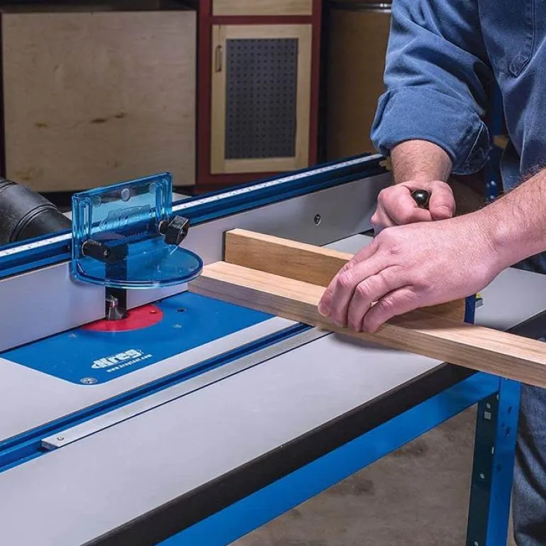 Jyrsintäpöydän mitat ovat 3/8 ”x 91/4” x 113/4 ”, joka tukee jopa suurimpia jyrsimiä. Pöydässä on Kregin uudet Level-Loc Reducing Rings -renkaat Nämä renkaat kierretään paikoilleen ja lukitaan levyn pintaan joka kerta. Mukana on kolme Level-Loc-rengasta: 1 ” 13/16″ (käytettäväksi Porter-Cable-tyylisten ohjausholkkien kanssa) ja 21/8 ”. Useita Level-Loc-renkaiden kokoja on saatavilla 5:n sarjassa (myydään erikseen). Levyssä on myös laserkaiverrukset alapuolella, joiden avulla se on helppo koota jyrsimestä riippumatta, ja siinä on sarja Kregs Precision Insert -tasoja.