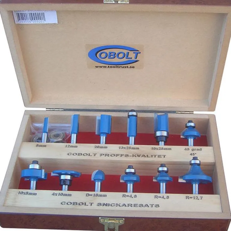 Coboltin 12-osainen nikkarinsarja, jossa on useita erityyppisiä jyrsintäteriä ja ylimääräisiä ohjauslaakereita.