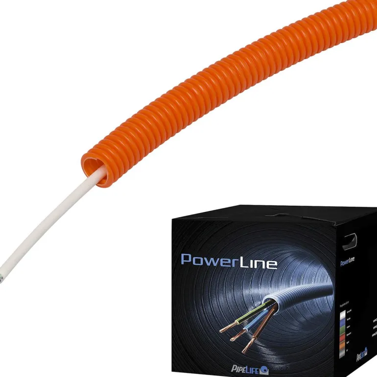 Pipelife Flexible Tread Tube PowerLine ELQXBE 1x4x0,5 16X100 ORANSSI 750N valukelpoinen Powerline on kartonkipakattu joustava putki, jossa on esireititetyt johtimet, jotka lyhentävät merkittävästi sähkö-, puhelin-, data-, antenni- ja palohälytyskaapeleiden asennusaikaa (jopa 40 %). PowerLinen suuri etu on, että putki voidaan vetää suoraan ulos koko pituudeltaan – ilman monimutkaisia ja tilaa vieviä keloja ja telineitä. PowerLine on valmistettu sekä PVC:stä että halogeenittomasta materiaalista. PowerLine toimii tietenkin aina puupalkkikerroksissa, mutta toimii hyvin myös valettuna. PowerLine on testattu kestämään 750 N painevalu. Putket ja sähkökaapelit ovat SEMKOn hyväksymiä. Lämpötila-alueet: -25 … +60°C