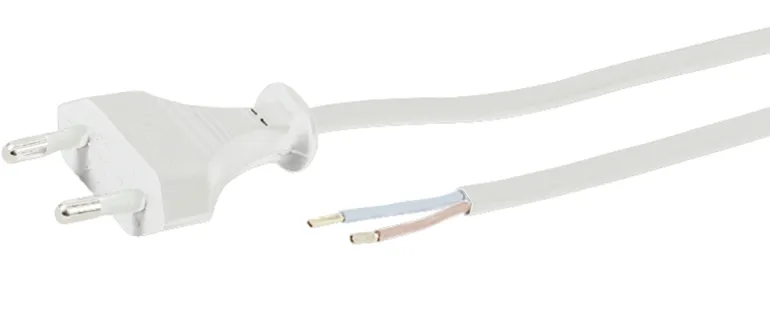 2404576 on valkoinen kaapelisetti 5 m ilman maadoitusta. Luokka 2. Suora EURO-pistoke toisessa päässä ja vapaa pää toisessa.
