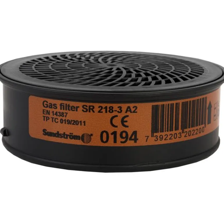 Kaasuilta ja höyryiltä suojaava suodatin, jossa on optimoitu imeytyminen. 2 luokan SR 218 -kaasusuodatin on suunniteltu käytettäväksi Sundströmin puoli- ja kokonaamareiden kanssa. Suodattimen ovat tyyppiä A ja suojaavat orgaanisilta kaasuilta ja höyryiltä, kuten liuottimilta, joiden kiehumispiste > +65 °C.