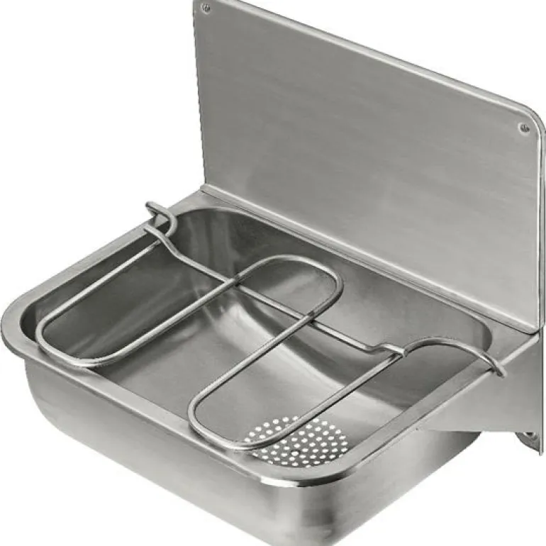 Ruostumattomasta teräksestä valmistettu kaatoallas, jossa on ritilä mutta ei ylivuotoaukkoa. Helppo asentaa seinään. Toimitetaan ilman vesilukkoa.