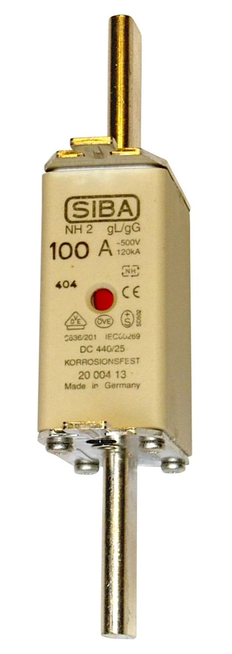 SIBA-kahvasulake, koko 2. Sulakkeen nimellisvirta on 125 A ja katkaisukyky 120 kA.