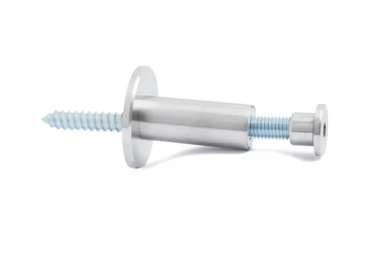 Messinkiset kaidehelat, vaihtoehtoisesti ruostumatonta terästä. Ruuvitappi M10x120 mm Kalustemutteri uralla vakioruuvitaltalle ja kuusiokoloavaimelle.