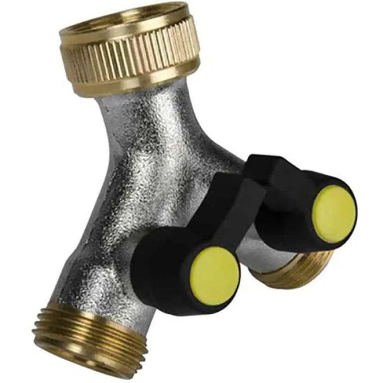 Jakoventtiili jossa sulut. Tuloaukko 1×¾” sisäkierre, sisäpuolinen mutteri. Poisto 2×¾” ulkokierre suluilla.