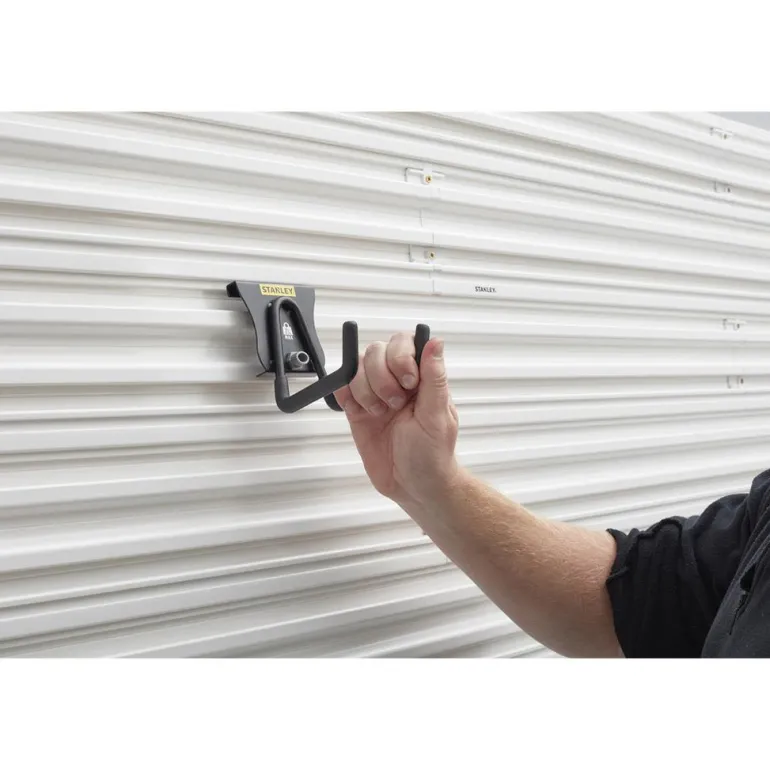 Lyhyt kaksoiskoukku seinäkiskoon. STANLEY® Track Wall System -kiskoon kiinnitettävä lyhyt koukku on täydellinen monien erilaisten pitkäkahvaisten työkalujen säilyttämiseen, esimerkiksi vasaroille, harjoille, lapioille ja letkuille. Kantavuus jopa 22,7 kg.