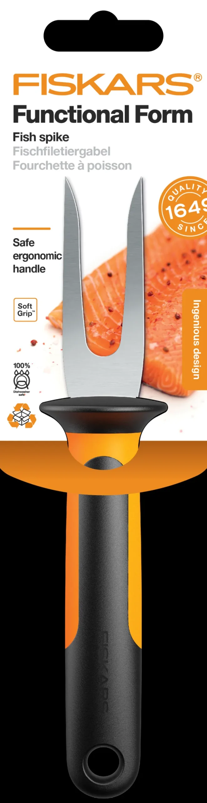 Kalahaarukka kaikenlaisten kalojen valmistamiseen. Haarukkaosa on valmistettu kestävästä japanilaisesta ruostumattomasta teräksestä. Ergonomisesti suunnitellussa kahvassa on hyvin asennettu sormensuojus. Konepesunkestävä.