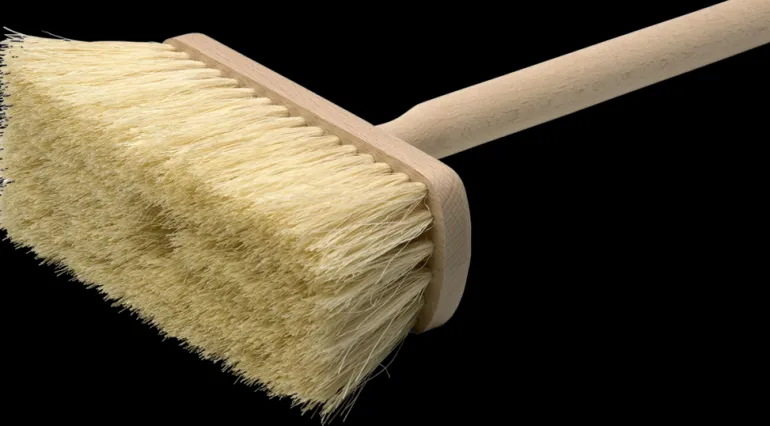 Anzan luonnonharjaksinen kalkkihakkuri. Käytetään tiilien happopesuun sekä muurien ja seinien kalkitsemiseen. Puisella kahvalla.