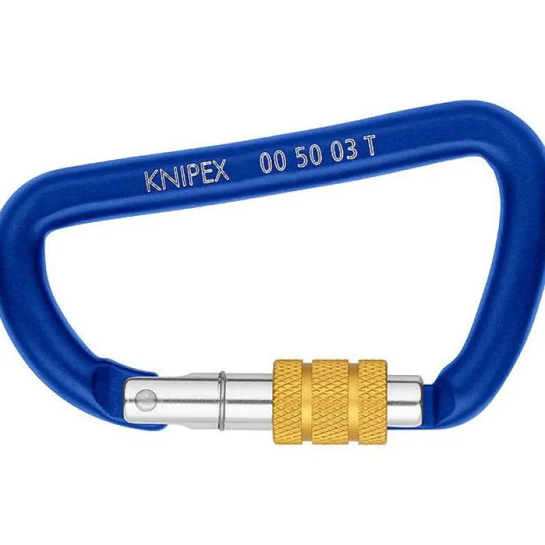 Knipex 005003TBK on 2 kpl alumiinikarbiinihakoja. Soveltuu muun muassa Knipex-sovitinsilmukan liittämiseen Knipex-kiinnikkeeseen tai kiinnikkeen kiinnittämiseen kiinteään kohtaan. Varustettu lepolukituksella parantamaan vetolujuutta.