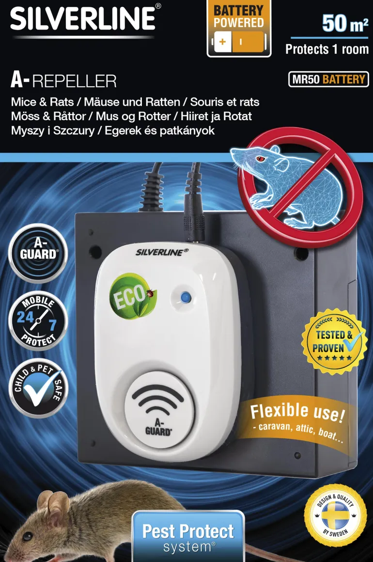Silverline MR 50 on elektroninen karkotin, joka pitää hiiret ja rotat poissa sisätiloista myrkyttömästi. Ainutlaatuinen Silverline A-Guard -ääniteknologia karkottaa tuholaisia tehokkaasti. Pistorasiaan kytkettävä laite kattaa jopa 50 m²:n alueen ja vaikuttaa välittömästi ja ympäri vuorokauden. Ainutlaatuinen A-Guard-ultraääniteknologia lähettää vaihtelevaa ja tarkkaan suunniteltua ultraääntä, joka häiritsee hiirille ja rotille ominaista käyttäytymistä ja viestintää ja luo eläimille sietämättömän ympäristön, minkä takia ne välttelevät kyseistä paikkaa. Ääni ei vaikuta ihmisiin eikä lemmikkieläimiin (lukuun ottamatta kotieläiminä pidettäviä jyrsijöitä), eivätkä karkotettavat eläimet totu ääneen. MR 50 ei häiritse muita elektronisia laitteita.