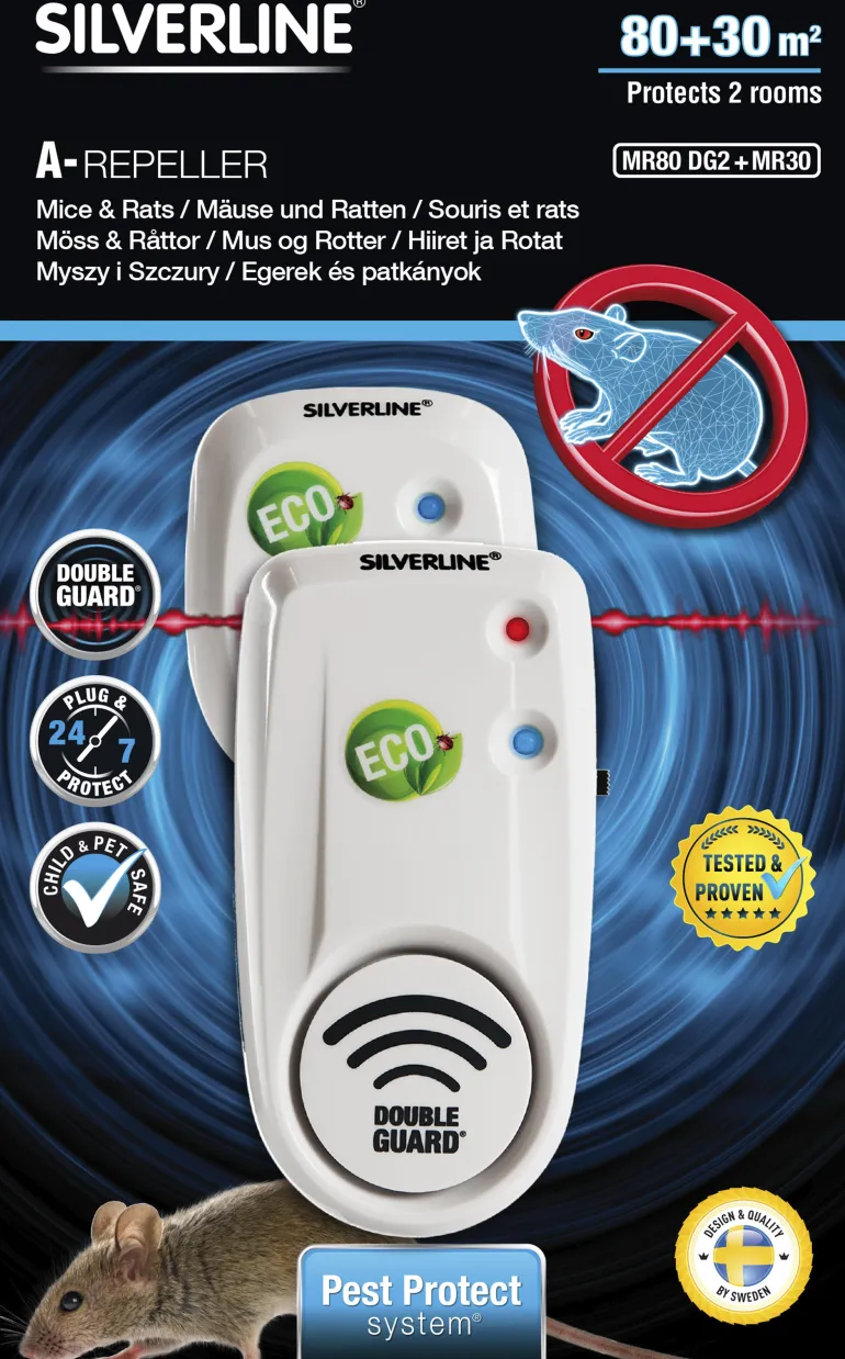 Silverline MR 80 DG 2 + MR 30 -paketti sisältää kaksi karkotinta, joissa käytetty ääniteknologia pitää hiiret ja rotat poissa täysin myrkyttömästi. Pistorasiaan kytkettävä MR 80 DG -laite kattaa jopa 80 m²:n alueen ja vaikuttaa välittömästi ja ympäri vuorokauden. MR 80 DG -laitteen teho perustuu A-Guard- ja Electro Pulse -teknologioiden yhdistelmään. A-Guard lähettää vaihtelevaa ja tarkkaan suunniteltua ultraääntä, joka häiritsee hiirille ja rotille ominaista käyttäytymistä ja viestintää ja luo eläimille sietämättömän ympäristön. Electro Pulse lähettää sähkömagneettisia pulsseja, jotka estävät hiiriä ja rottia käyttämästä kaapelointeja kulkureittinään. MR 30 -laitteen teho perustuu A-Guard-ääniteknologiaan, ja se kattaa 30 m²:n pinta-alan. Ääni ei vaikuta ihmisiin eikä lemmikkieläimiin (lukuun ottamatta kotieläiminä pidettäviä jyrsijöitä), eivätkä karkotettavat eläimet totu ääneen. Karkotin ei häiritse muita elektronisia laitteita.