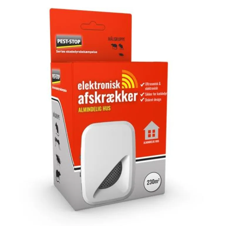 Elektroninen karkote pieneen taloon. Ultraääniaallot karkottavat sekä jyrsijät että hyönteiset. Hälyttimen muotoilu on huomaamaton ja tyylikäs. Se kytketään pistokkeeseen ja lähettää sähkömagneettisia sykäyksiä, jotka kulkevat talon sähköjohtoja pitkin ja karkottavat jyrsijöitä. Sykäyksistä ei ole haittaa lapsille, lemmikeille tai raskaana oleville.