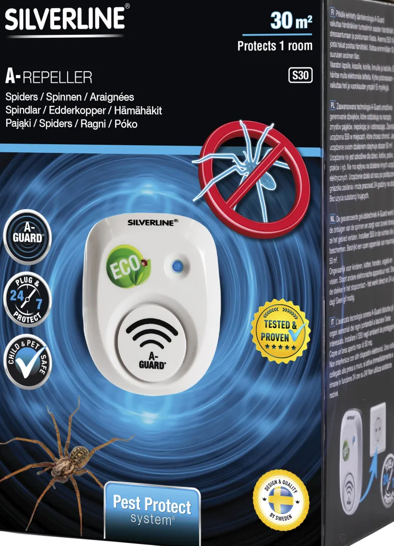 Silverline Spindelfritt S30 on elektroninen karkotin, joka pitää hämähäkit loitolla. S30 kattaa jopa 30 m²:n avoimen alueen ja tuottaa ultrataajuista ääntä, joka vaikuttaa hämähäkkeihin ja muihin ryömiviin hyönteisiin. Hämähäkit välttelevät tiloja, jossa ääni kuuluu. Ääni on vaaraton lapsille, kissoille, koirille, linnuille ja kaloille.