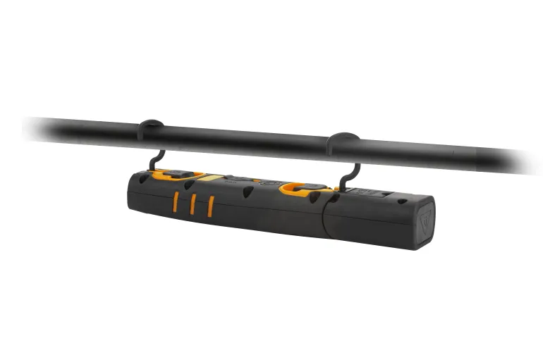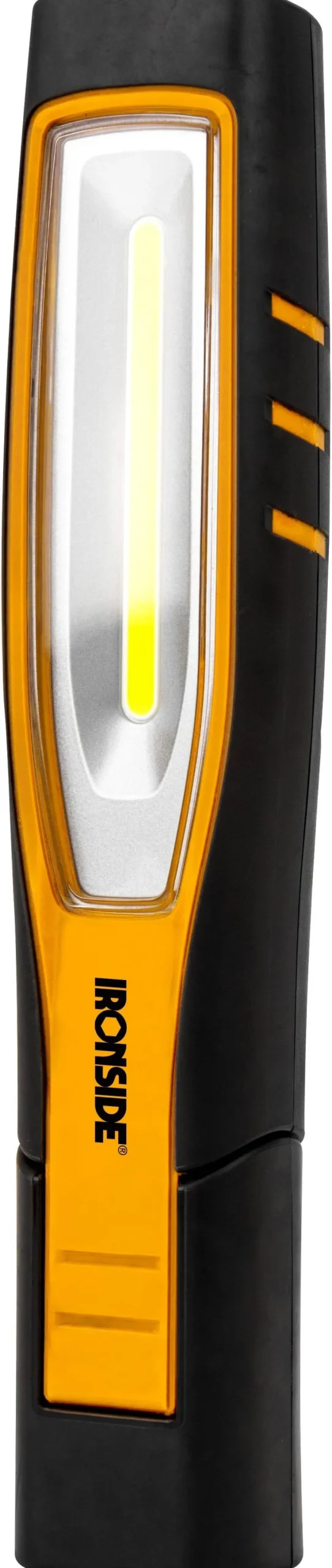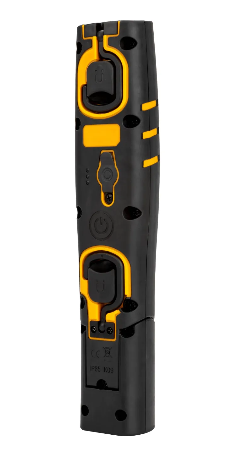 Taivutettu ladattava ledilamppu, musta-keltaista iskunkestävää ABS-muovia, erittäin vahvat magneetit, 2 takana ja 1 pohjalevyssä. 2 pyöritettävää koukkua. Työvalossa kolme säätöä, enintään 750 luumenia, sekä 200 lm ylävalo. Lamppupää säädettävissä 180°. Ledimerkkivalo näyttää akun varaustason. USB-laturi sisältyy toimitukseen.