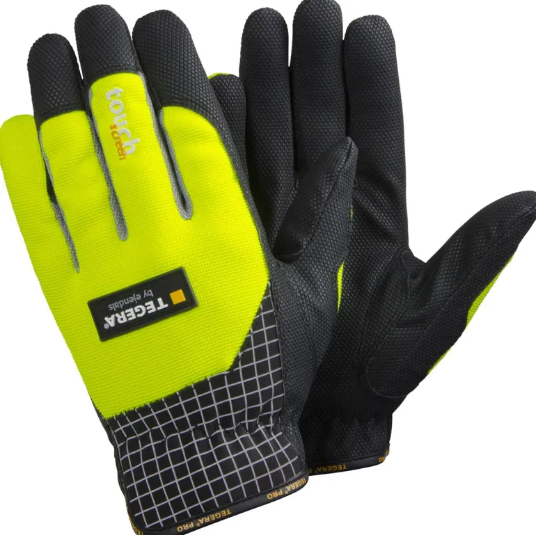 Kuvaus: Ergonomisesti muotoiltu, heijastin, kosketusnäytöille, lyhyt malli, ei sisällä kromia, vahvike etusormessa, huomioväri, vahvistetut saumat, yksityiskohtainen suunnittelu, vahvikkeet sormenpäissä, nivelletyt sormet, erikoissuunniteltu peukalo-osa