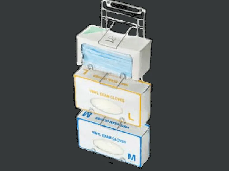Seinälle kiinnitettävä pidin esim. kertakäyttökäsine- ja hengityssuojainpakkauksille. Maximisyvyys ja -korkeus pakkauksille: S 95 mm ja K 140 mm.
